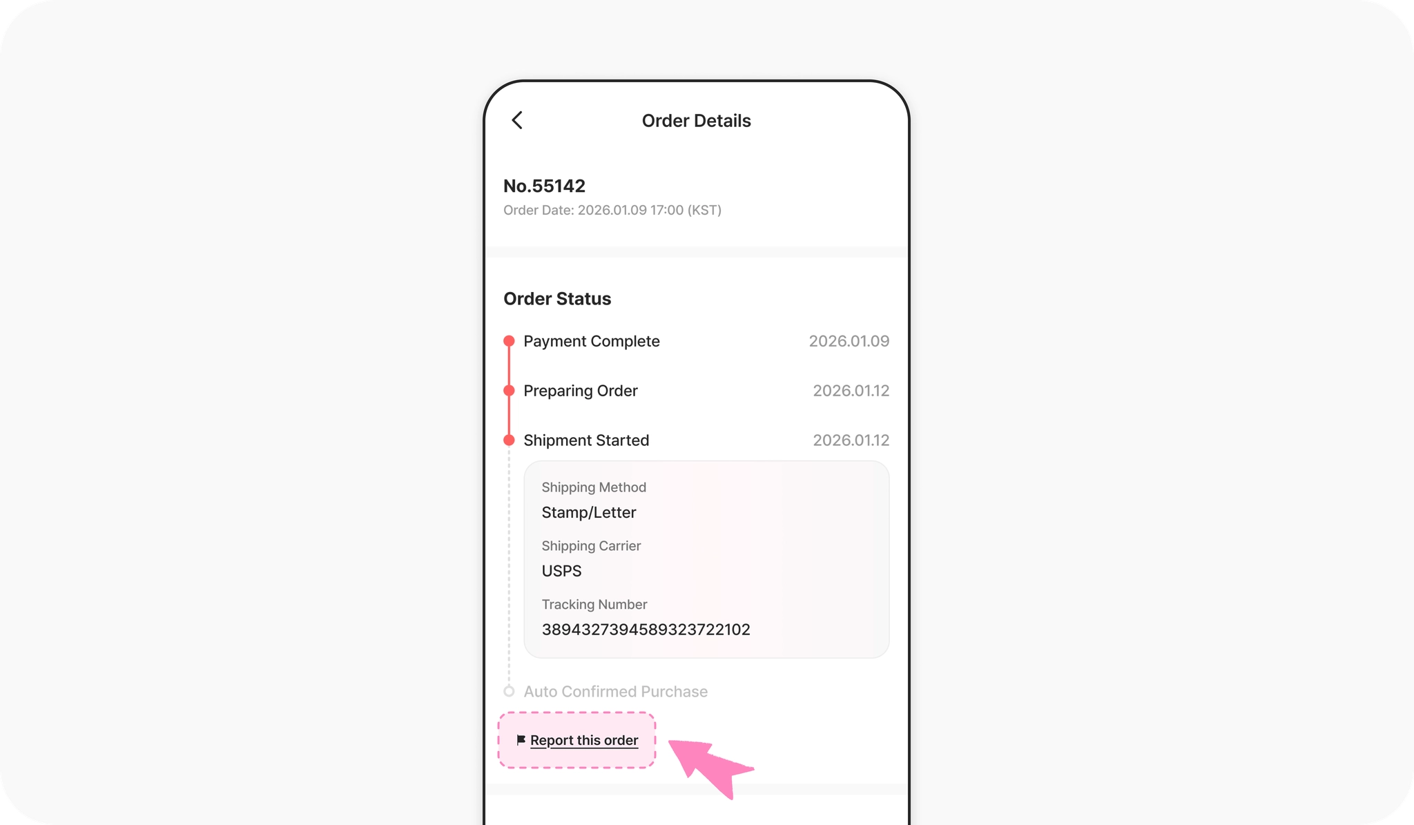 You can submit a report through [Used] Order List > View Details(Order Details) > Report this order
