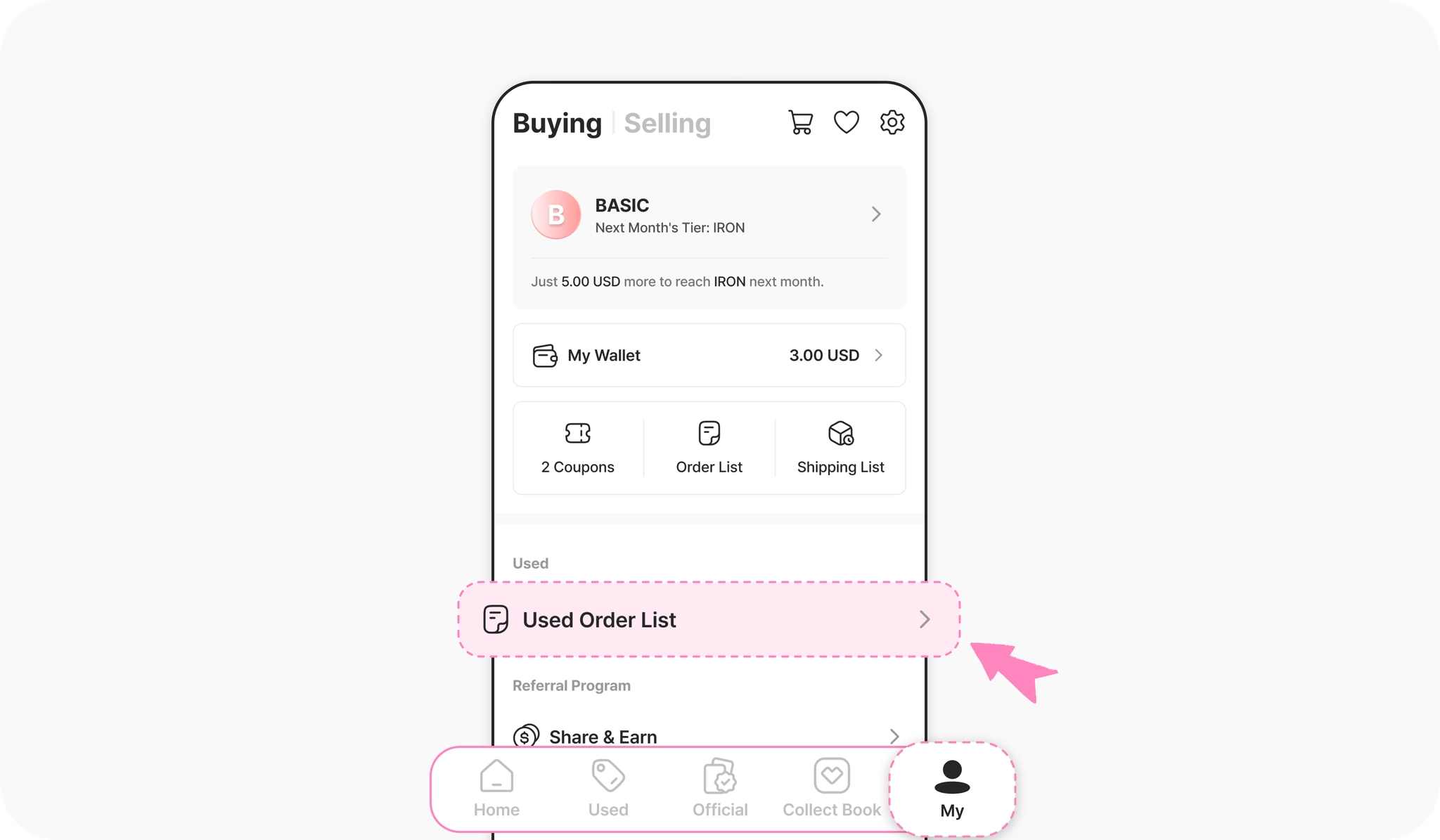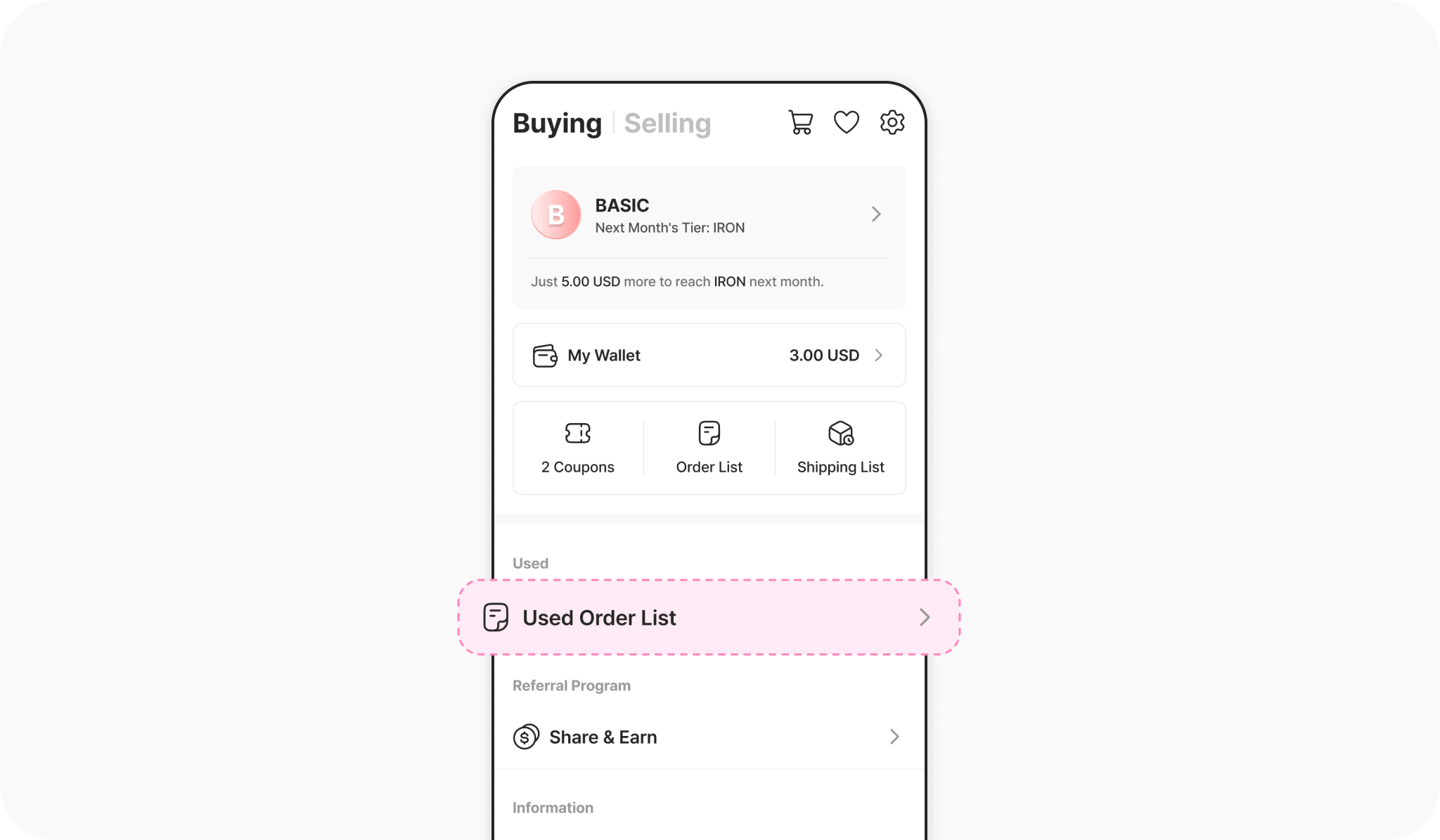 You can find your cart on [Used] by going to Sellers at the bottom of the app and then tapping the bag-shaped icon at the top of the screen.